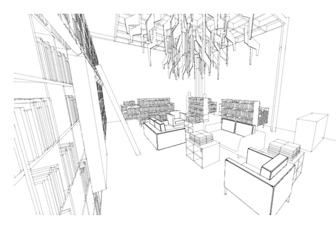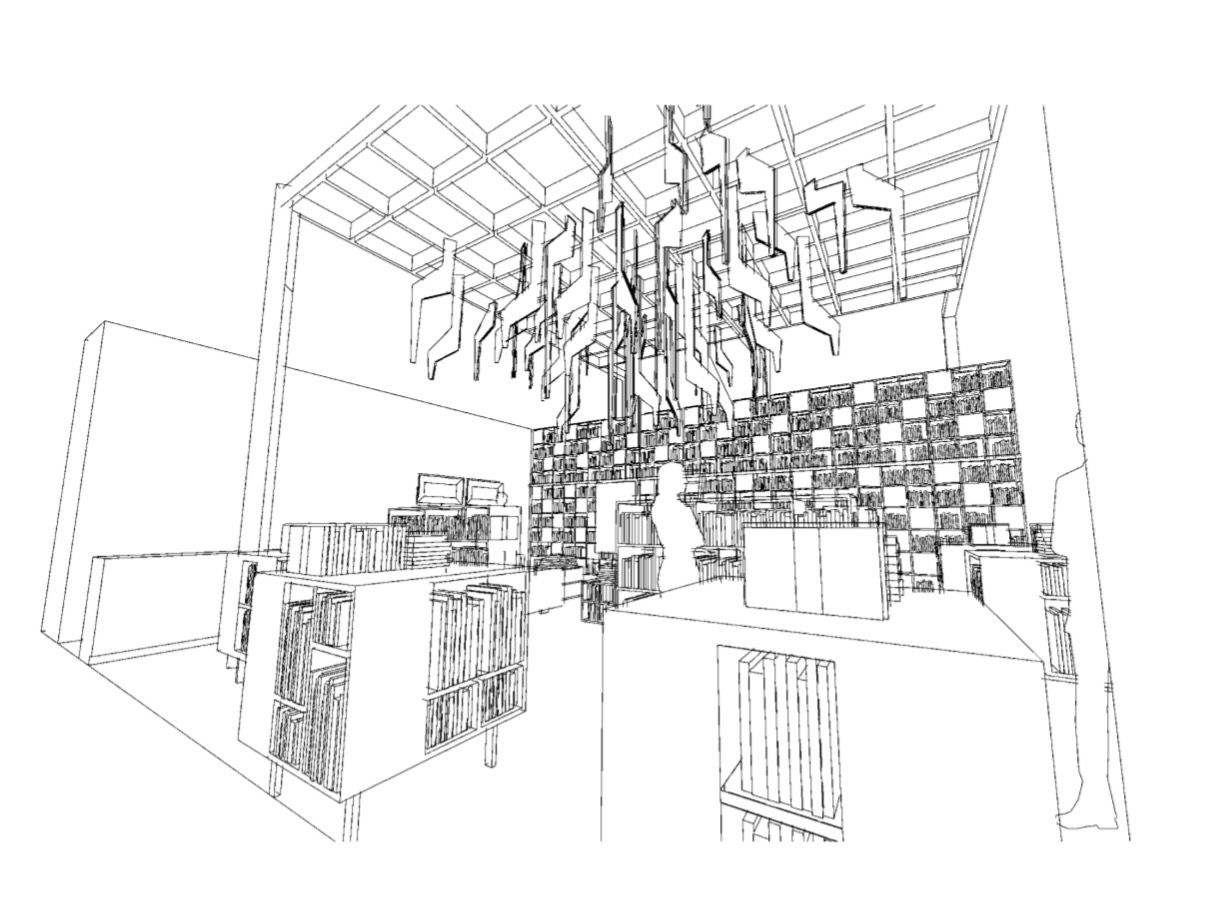 La propuesta se dividió en dos partes, la primera contemplaba un espacio de exhibición de libros con una capacidad de más de 3,000 libros contemplando un librero de 3 m. de altura para ser usado por una escalera deslizable. Y la segunda área se proyectó una sala de lectura el cuál fue agradecido por los visitantes como un espacio de remanso dentro de la feria.