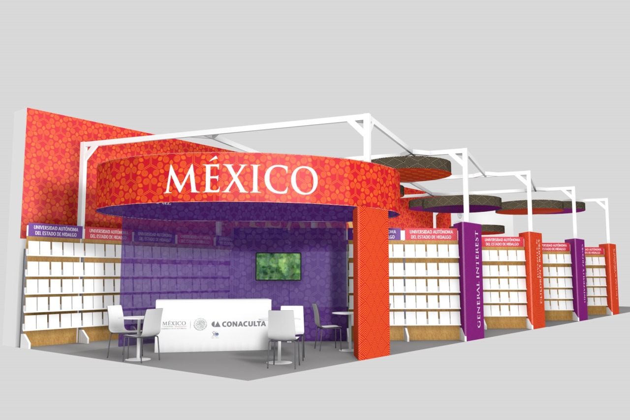 Dentro de los requerimientos del stand era exhibir más de 1,200 libros en un espacio de de 144 m2, sin olvidar los espacios de relaciones, negociación y operativos del espacio.